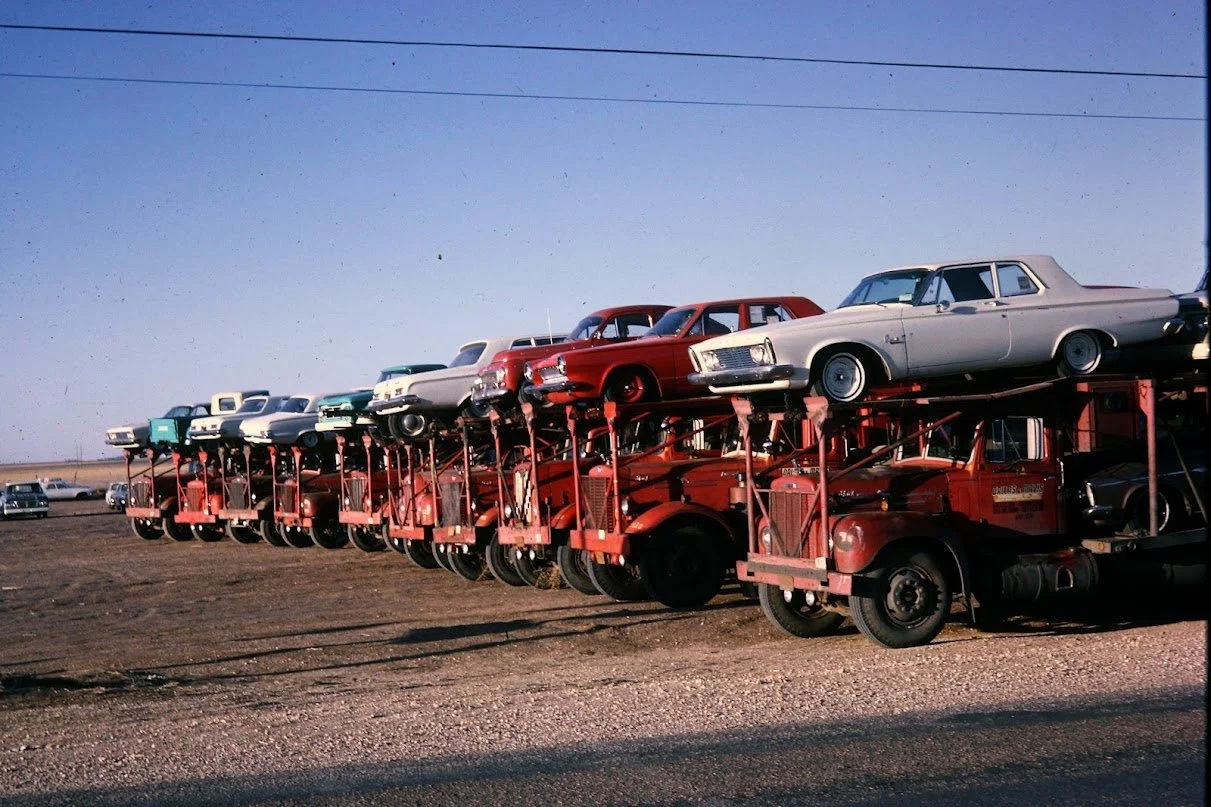 Bill Bonds took this photo in the fall of 1963 while working at a trucking company in Portales, NM. A trainload of Dodges and Plymouths (and one lonely Volvo) had been loaded up for delivery to dealers. The hubcaps would be in the trunks wrapped in wax paper.